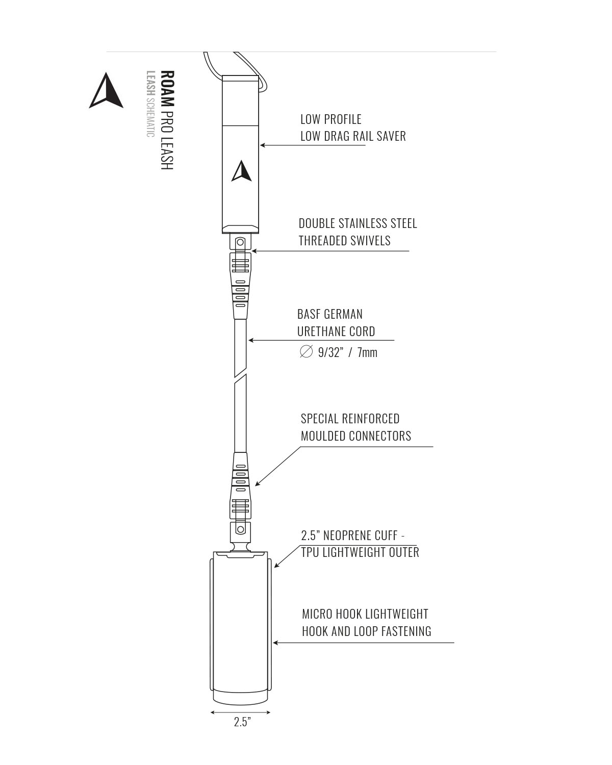 The Roam Pro leash is our most loaded leash. The cuff is neoprene with a TPU outer - lighter weight and low absorption. This makes a low profile, low weight ankle cuff. The cord is highest quality BASF Urethane from Germany, super strong and super durable. Stainless swivels and folded connectors keep it twist free and out of the way. Like the best products this will quickly become your go to leash.
